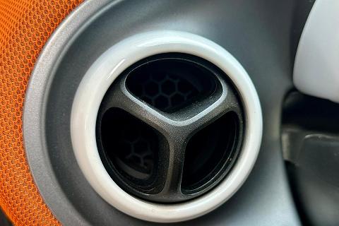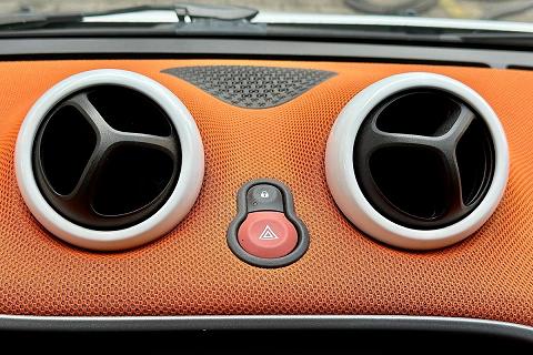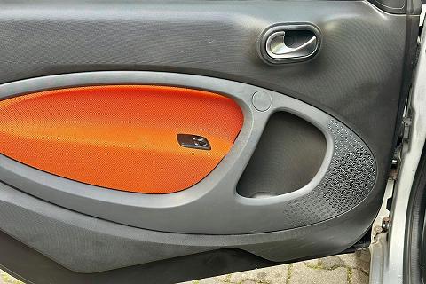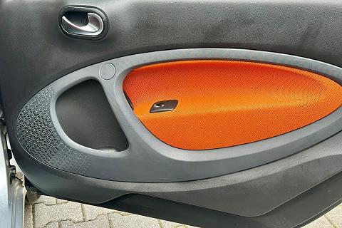 | Plancia e pannello centrale delle porte in tessuto mesh arancio e modanature nero e antracite |