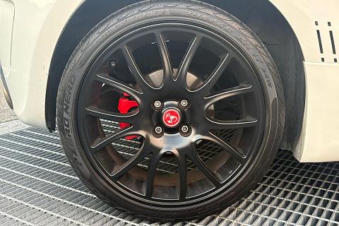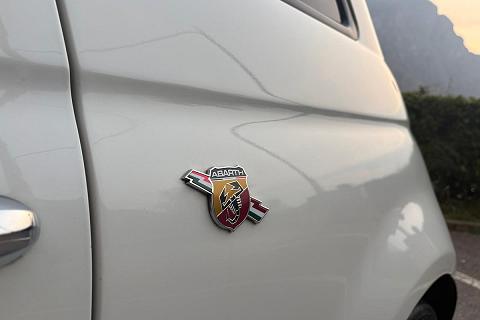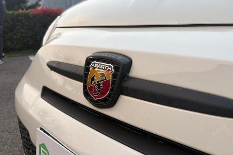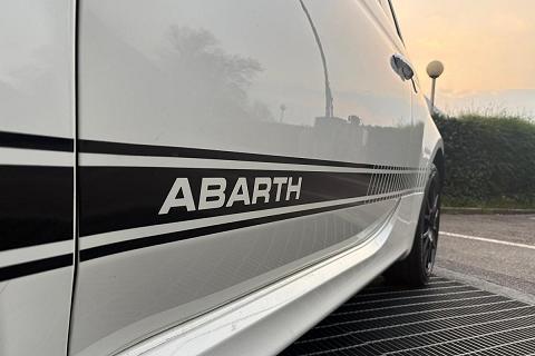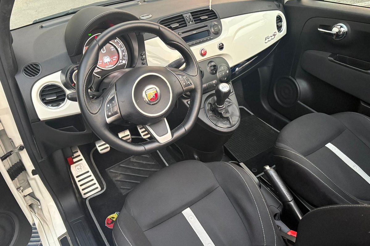 carrozzeria bianca con bande Abarth nere appena applicate, capote nera, pinze freno rosse e cerchi sportivi che valorizzano l’estetica aggressiva della vettura.