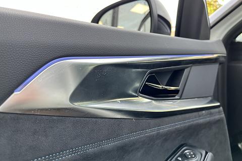 | Bracciolo porta in Alcantara e centrale in TEP con cuciture blu |